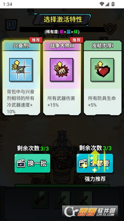 等级提升与强化选择:消灭敌人积累经验升级,升级后可从3种不同稀有度的强化效果中选1种,例如经验III,兴奋剂 I,战争大师 I,每次升级有3次刷新强化选项的机会,可灵活调整战斗策略。