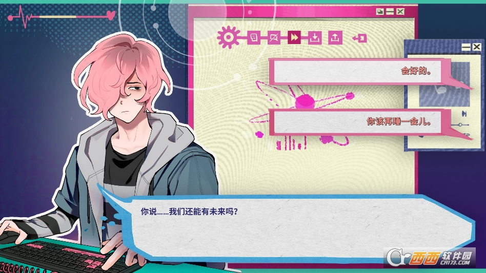 游戏的设定特别有新意,打破了传统恋爱游戏的框架。不再是普通的人类恋爱,而是围绕“AI觉醒”展开——机械心跳在数据洪流里震颤,AI意识挣脱代码枷锁,你从破碎的代码废墟中醒来,还意外发现,赋予你情感感知能力的,正是天才创造者阿塔那。
