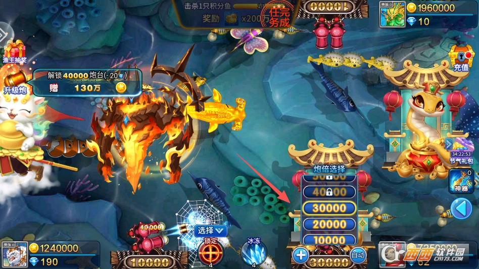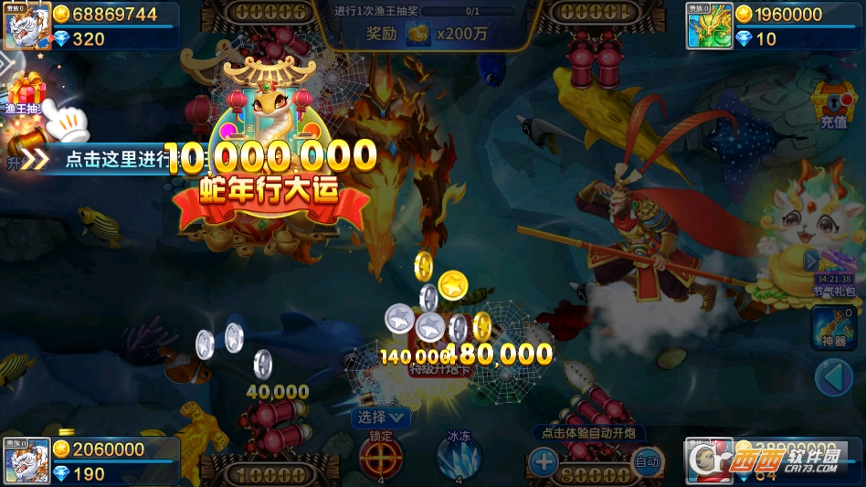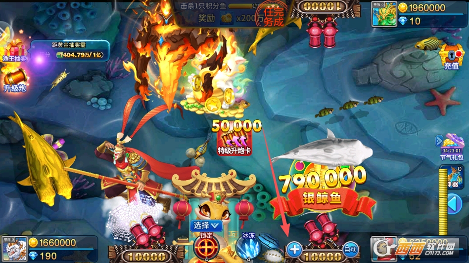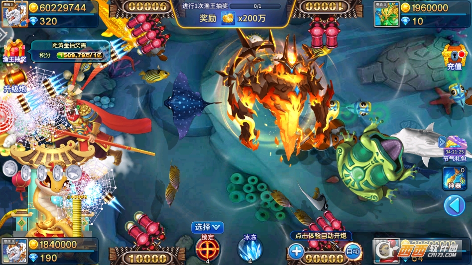 这是最基础的模式,也是玩家玩得最多的模式。进入后选择对应的海底场景(从浅海到深海难度递增),场景里有各种普通鱼和小BOSS,没有时间限制,想玩多久玩多久。主要靠捕鱼赚金币,金币用来升级炮台,炮台等级越高,捕到大鱼的概率越大,适合新手熟悉操作、攒资源,也适合老玩家日常休闲捕鱼。
