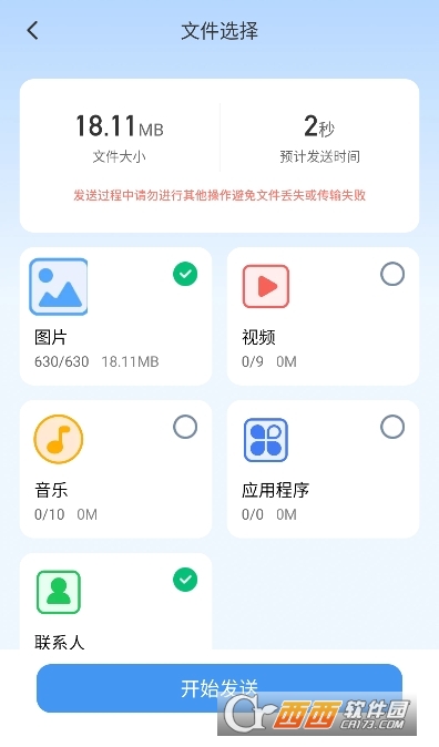 4、连接成功后,发送端手机将清晰展示所有可迁移的数据类型,包括联系人、短信、通话记录、照片、视频、音乐、文档及已安装的应用列表。