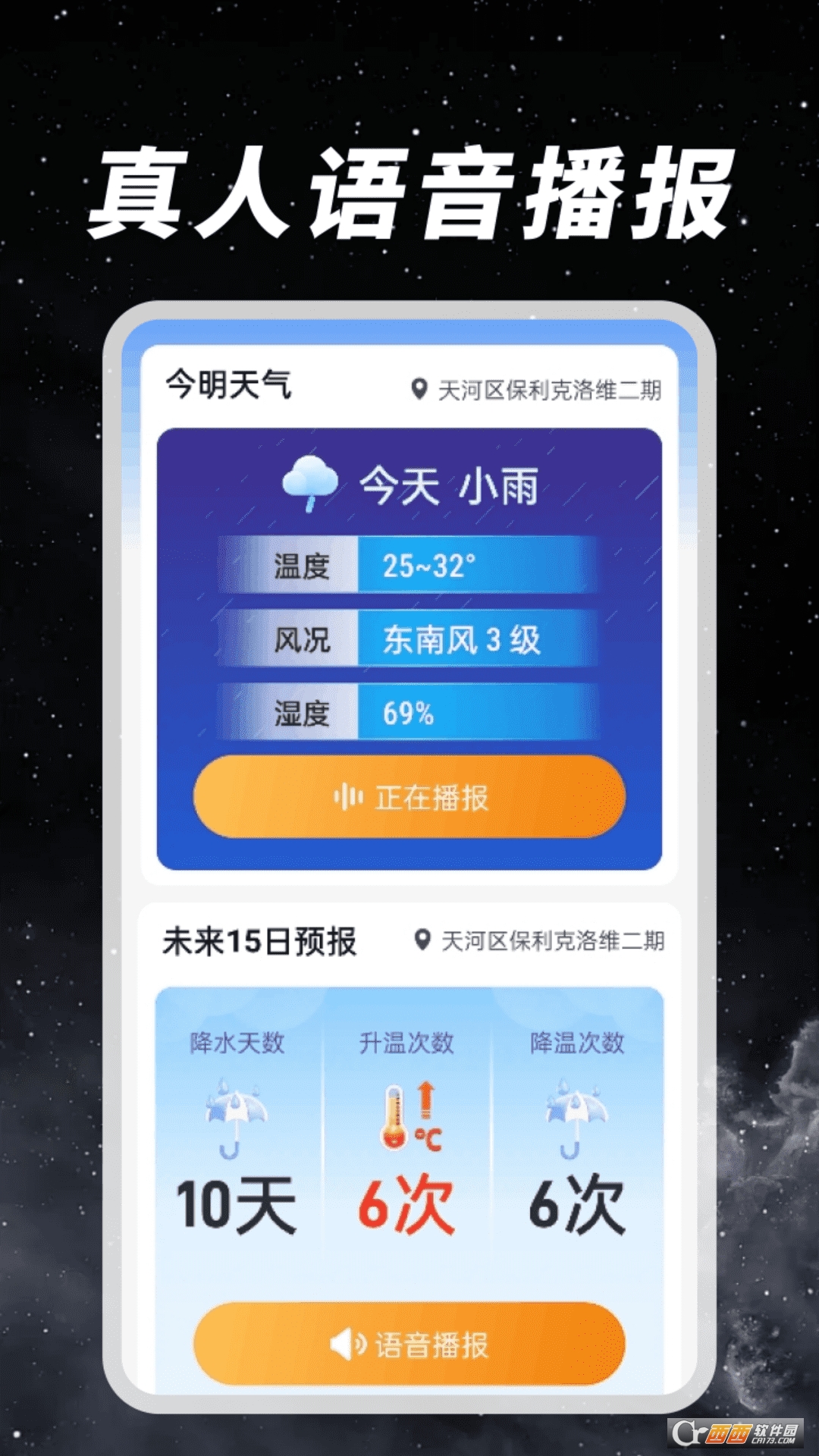 软件界面干净简洁,没有多余广告,打开就能用。不管是年轻人还是长辈,都能轻松上手,让天气查询变成一件特别简单的事。温度、降水这些关键信息,不用找不用划,语音直接告诉你。