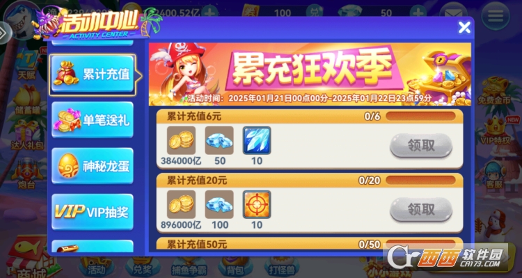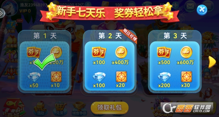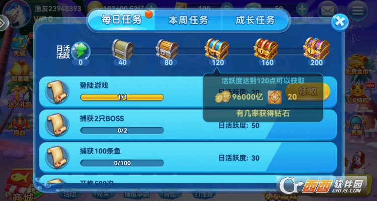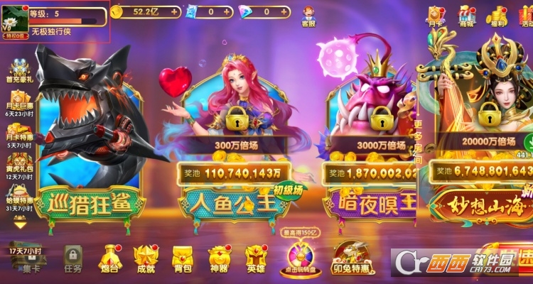 2、丰富道具与限时活动:游戏的核心乐趣之一在于发现精彩的道具和活动体验。无论是清屏的“核弹”、冻结全场的“极寒领域”,还是锁定目标的“追踪导弹”,都能在关键时刻助你扭转战局。同时,游戏内“夺宝奇兵”、“BOSS围剿”、“幸运抽奖”等不同类型的捕鱼玩法轮番上阵,让你永远有新的目标可以追逐,永不厌倦。