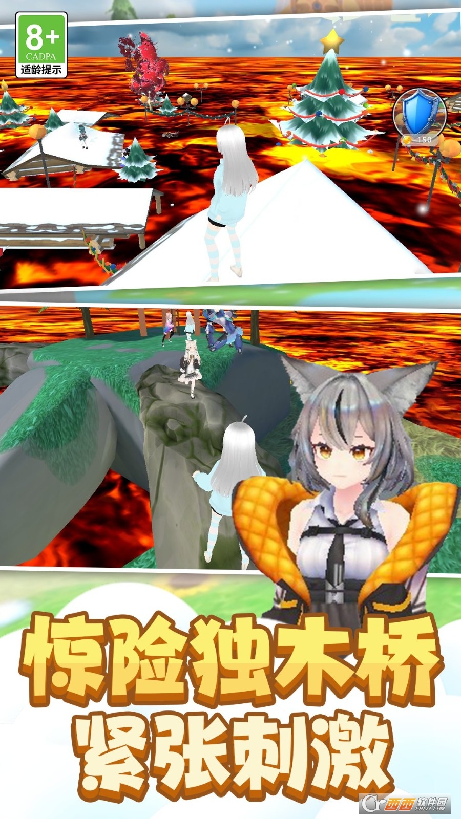 收集金币是核心操作之一,不仅能买道具,还能解锁新角色和时装。遇到摇晃的独木桥要格外小心,踩错一步就会掉下去,得稳住节奏精准落脚。