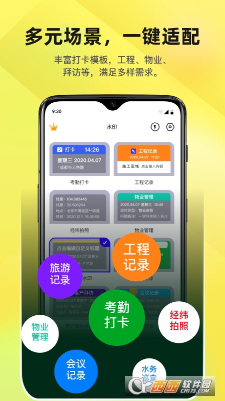 场景模板更丰富实用,针对工程、物业、考勤等不同场景,设计了专属的水印模板。不用自己手动编辑内容,选择对应模板就能一键生成符合场景需求的水印,节省大量操作时间。