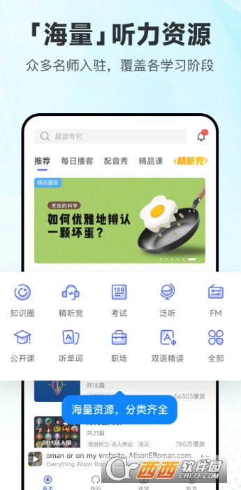 全场景资源矩阵:覆盖考试(四六级、考研、雅思托福等)、兴趣(影视原声、名人演讲、公开课)、职场商务等多维度内容,每日更新精选素材,从7岁少儿到成人学习者均能找到适配资源,实现一站式听力学习。