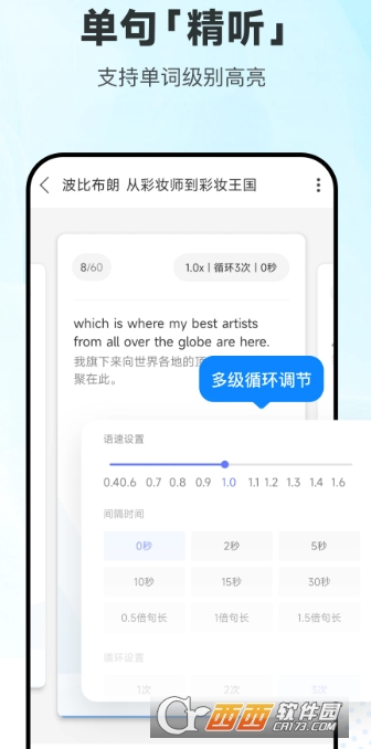 多级精听训练系统:支持 0.4-1.6 倍 8 档语速调节、1-3 次循环设置及 0 秒 - 30 秒 + 倍句长多档位间隔时间选择,搭配单词级高亮同步文本,可针对单个难点句反复打磨,精准攻克连读、弱读等听力痛点,适配从基础到高阶的精听需求。