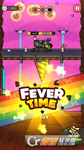 自动化挖掘与资源收集:操控钻井设备在垂直或棋盘式地图中自动向下挖掘,机器两侧的小人会自动采矿获取经验,同时需收集上方掉落的增益道具(如提升挖掘效率的道具);挖掘进度可在左侧查看,抵达星球最底层即可完成关卡,领取对应奖励。