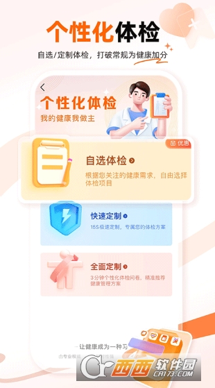 个性化体检定制:支持 “自选项目 + 问卷定制” 双模式,15 秒极速匹配基础方案或 3 分钟深度问卷精准推荐,涵盖防癌筛查、慢病评估等多元项目,打破固定套餐限制,无论是职场人士、中老年群体还是备孕人群,都能贴合专属健康需求。