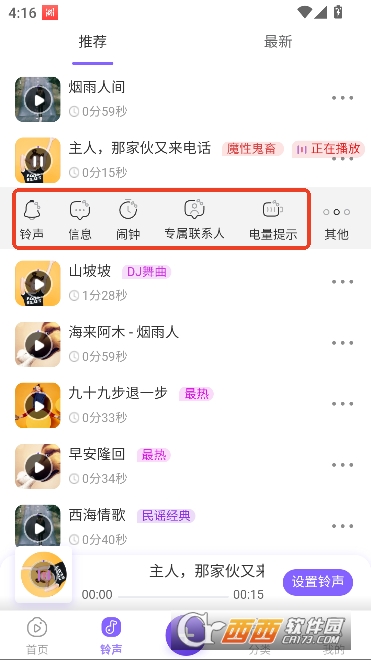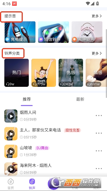 3、点击下方铃声选项,可以设置手机的各种提示音。