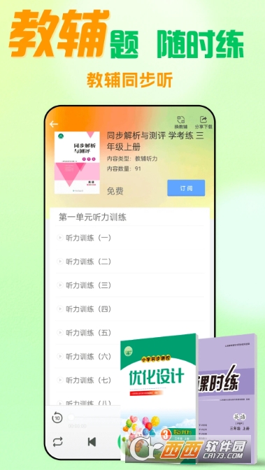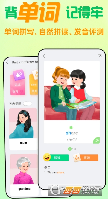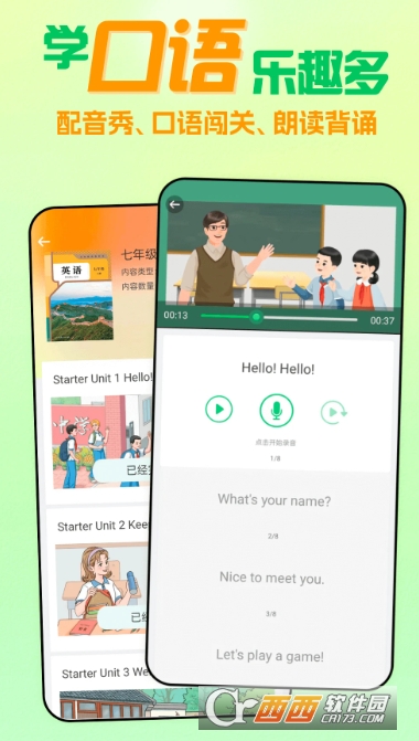 依托中美教学专家联合原创的优质内容,软件创新性融合口语对话、智能评测、闯关游戏等多元形式,打造沉浸式学习体验。2000 组贴近学生生活的场景对话、1000+生动教材动画配音秀,搭配英语大咖赖世雄逐页领读,让枯燥的英语学习变得趣味盎然。同时,智能语音引擎实现逐句打分纠音,配合点读、连读、复读、听写、拼读等多功能,全方位夯实听说基础。