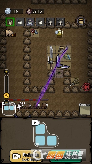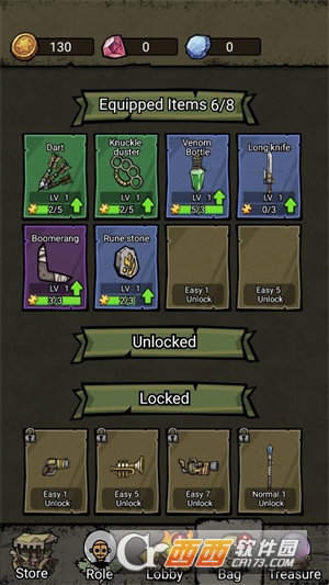 游戏的塔防核心玩法丰富且有深度,玩家可解锁飞镖、长刀、毒液瓶等多样武器,通过银币解锁新装备或合并相同武器升级,搭配 “基础攻击力加成”“眩晕控制” 等随机强化效果,打造专属防御体系。背包系统的加入让策略性更上一层楼,需根据敌人类型灵活筛选装备,平衡攻防需求。