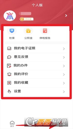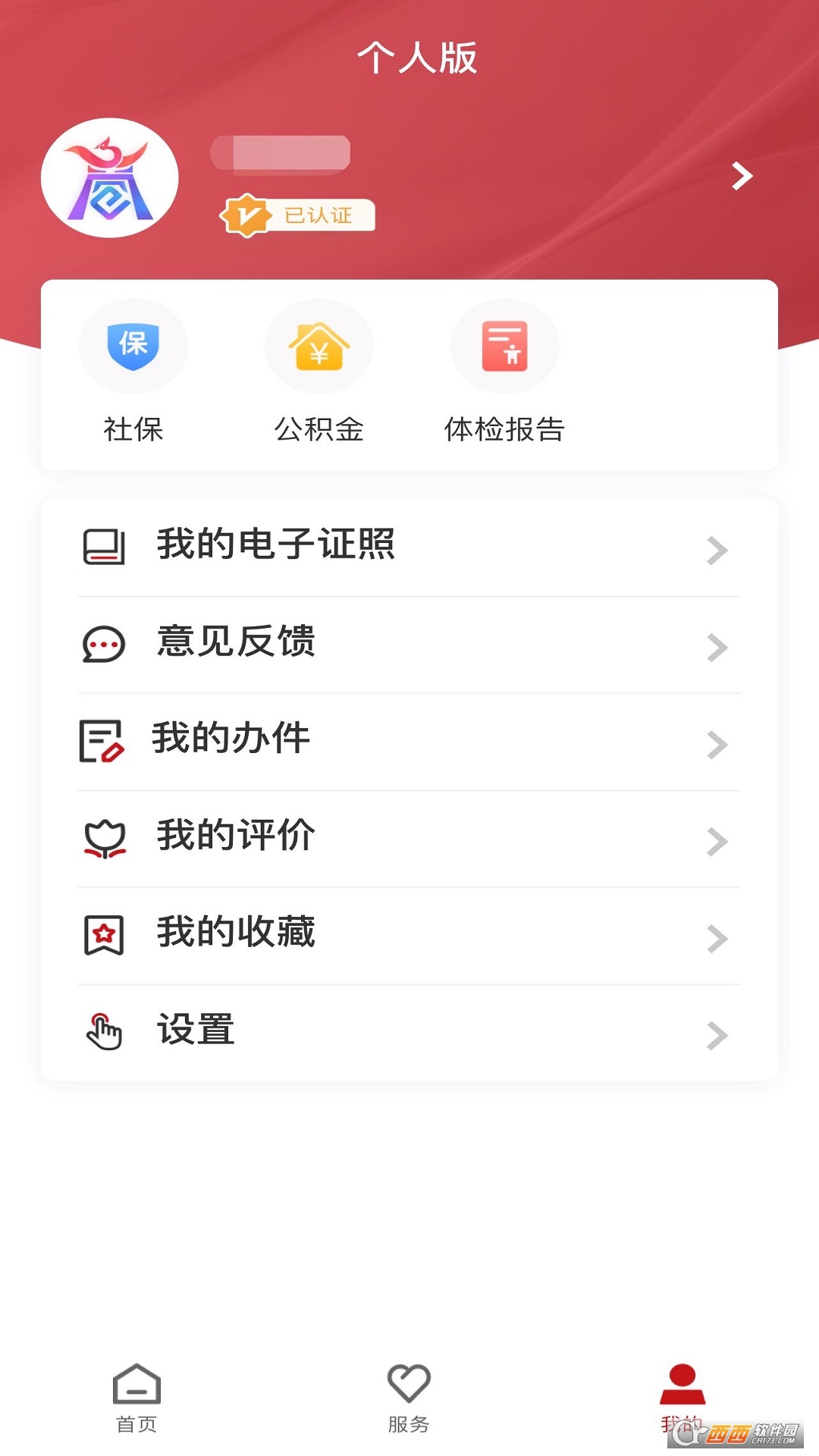 5、在“我的”页面可查看社保、公积金、体检报告等信息,同时可使用电子证照、我的办件、意见反馈及收藏功能。