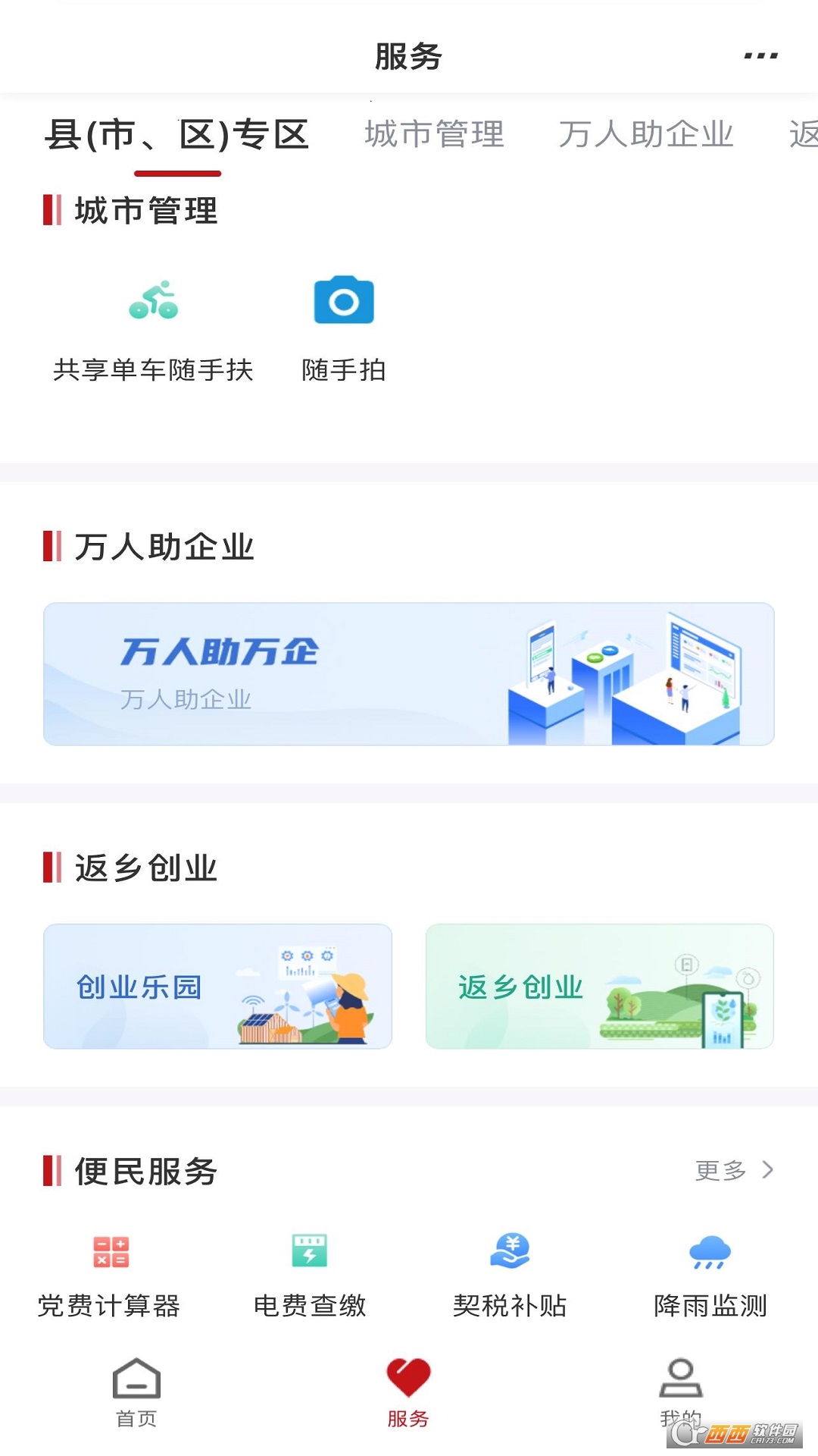 3、服务页面汇集城市管理、万人助企、返乡创业、便民服务等功能,用户可根据需求选择对应服务模块进行操作。