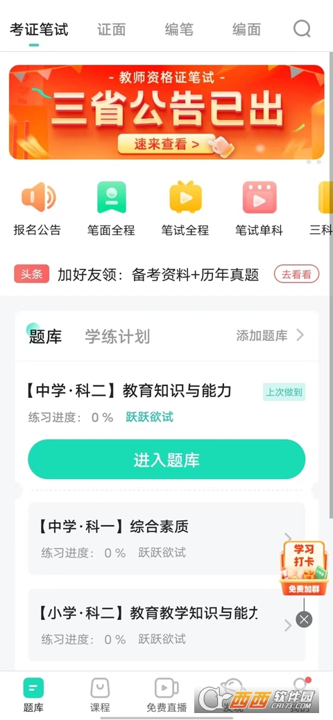 核心功能涵盖考试全流程,从教师资格证笔试、面试,到教师招聘笔试、招聘面试,每个环节都提供针对性的课程和资料库。海量真题题库实时更新,搭配详细的解析说明,帮助考生精准把握考点;名师免费直播授课更是一大亮点,专业老师在线讲解干货知识,还能实时互动答疑,快来体验吧。