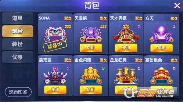 不同的炮台有不同的特性及技能。可在捕鱼房间中,点击“炮台”进入“更换炮台”系统即可预览所有炮台的特殊属性,根据捕鱼场次需求更换炮台。