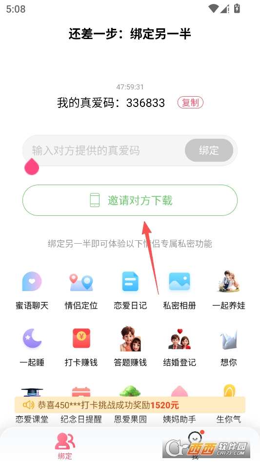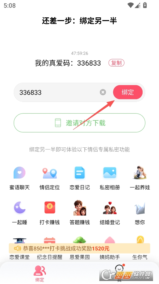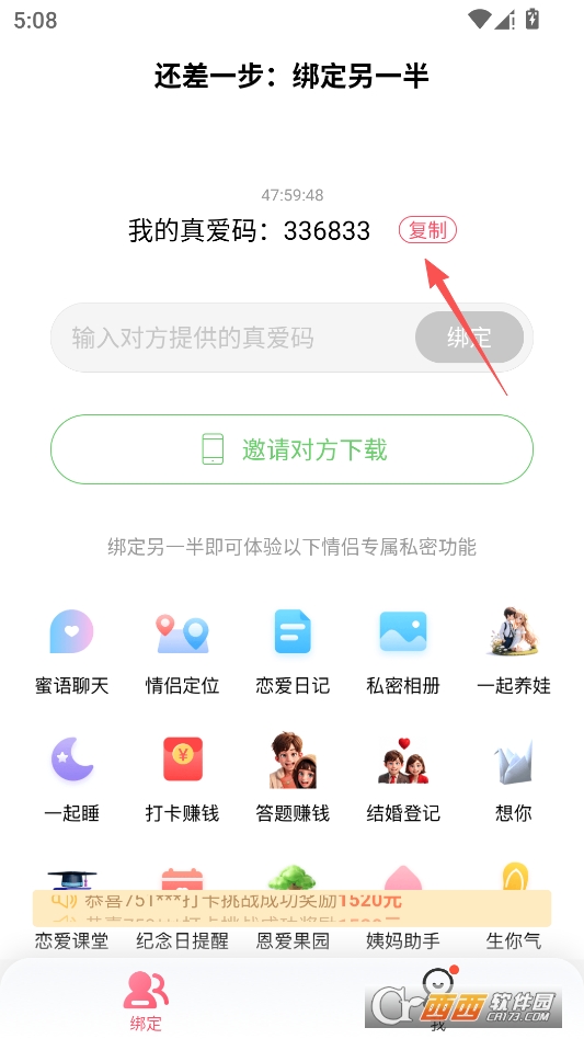 然后对方进入主页输入你的真爱码进行绑定即可