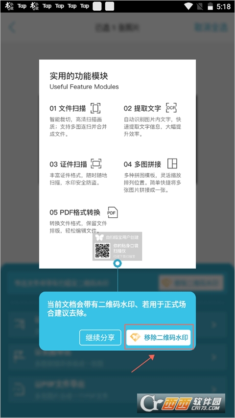 然后点击“移除二维码水印”即可。注意水印去除服务需要升级扫描宝的VIP功能。