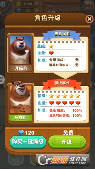 多元养成与装扮:支持角色升级(用钻石提升血量、金币 / 道具加成)、宠物孵化养成(提升属性加成),还能为角色搭配多样化皮肤(如船长熊大、功夫熊),满足个性化需求,部分稀有皮肤需完成成就解锁。