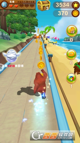 1、点击屏幕进行左右滑动,控制熊大躲避各种障碍物,上滑跳跃,下滑可以铲步。