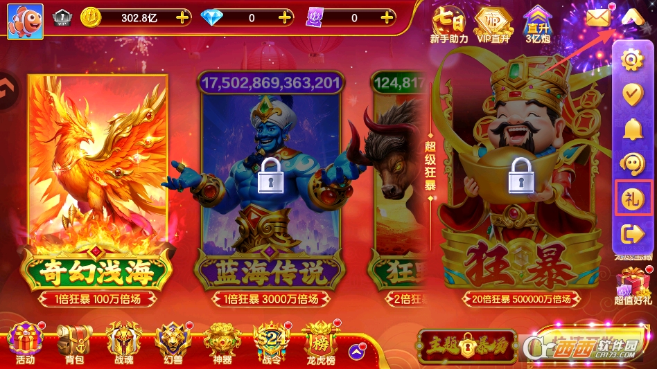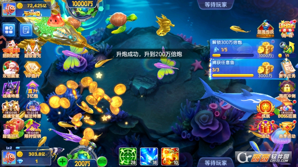 1. 丰富炮台自由切换,适配不同捕鱼场景。游戏内提供了多种类型的炮台,从基础的普通炮到威力强劲的激光炮、范围伤害的霰弹炮,每种炮台都有独特的攻击效果。随着等级提升,还能解锁更高倍率的炮台,大幅提升捕鱼效率,应对不同体型的鱼群。