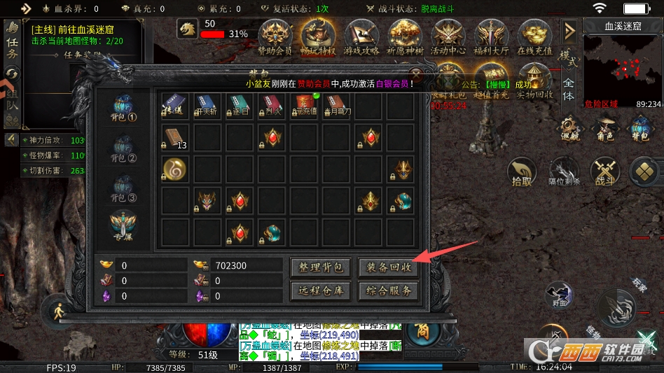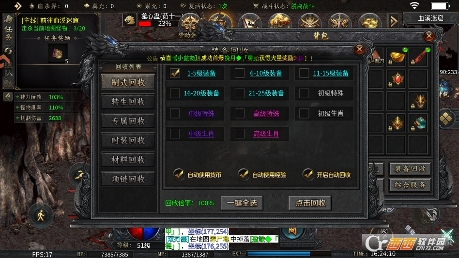 2. 自动功能全解锁,解放双手轻松打宝。上线就免费赠送自动回收和自动拾取功能,无需额外氪金解锁。打怪过程中自动拾取所有掉落物品,闲置装备自动回收兑换元宝,不用手动操作繁琐流程,专注战斗的同时还能高效积累资源,彻底告别手忙脚乱。