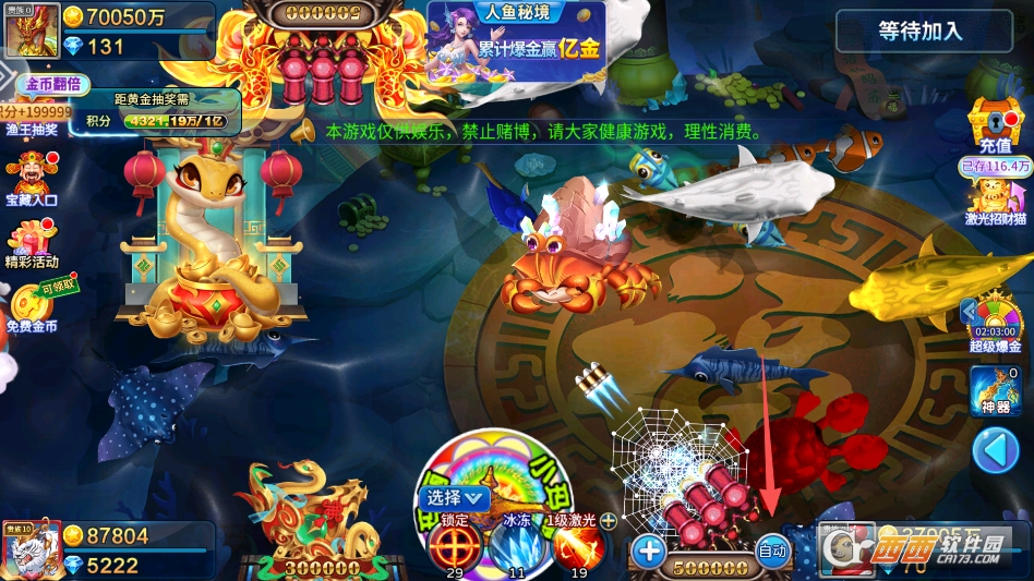 炮台升级需搭配技能使用才能发挥最大效果,冰冻技能适合锁定BOSS,闪电技能适合大范围清场,根据捕鱼场景灵活切换。同时注意倍率调节,打小鱼用低倍炮节省金币,攻击BOSS时再开高倍炮,提升资源利用率。