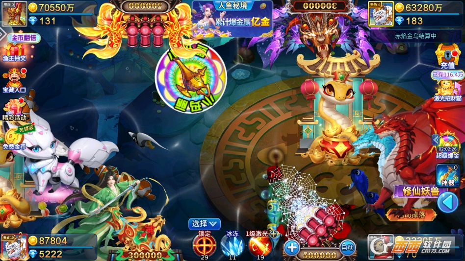 2. 组队BOSS围剿玩法,每日定时刷新巨型BOSS,需多人协作挑战才能高效击败。成员分工明确,部分玩家负责清理小鱼维持金币供应,部分玩家集中火力攻击BOSS弱点,击败后按输出占比分配奖励,掉落的稀有道具可用于升级炮台技能,强化战力。