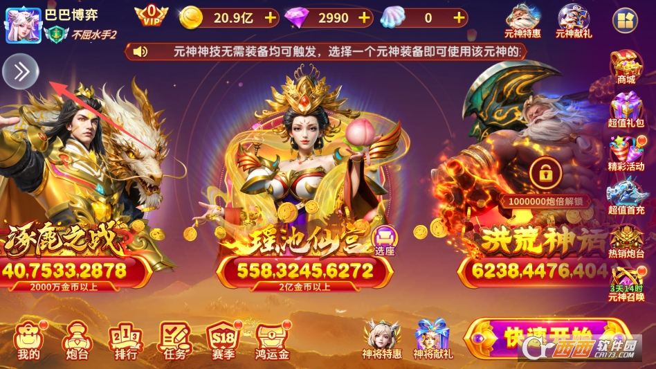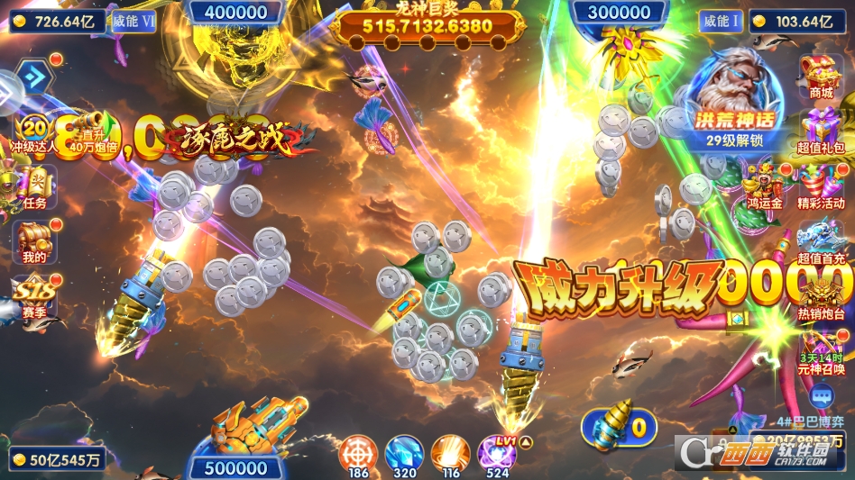 2. 全民赛模式:属于核心竞技玩法,玩家拥有固定数量炮弹,发炮不消耗金币,炮倍固定为100倍。第一次报名免费,后续报名只需少量金币,每场比赛最多可参加10次,按最高积分排名发奖,积分相同按完成时间先后排序,奖励通过邮件发放,竞技公平性很强。