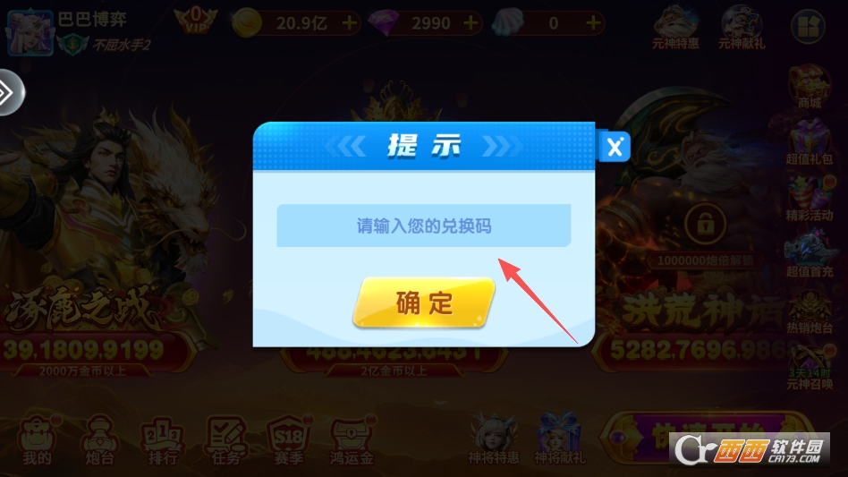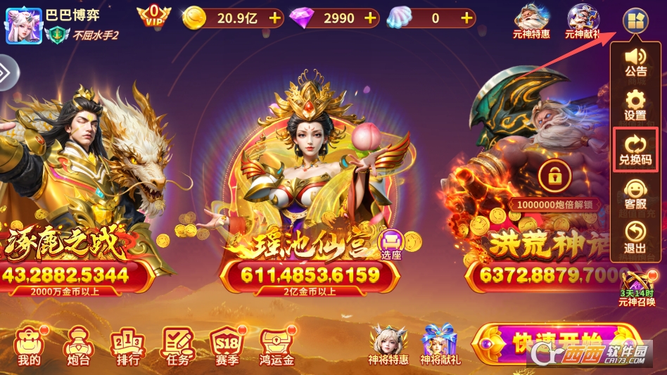 点击主界面右上角的按钮,即可呼出一个菜单,我们点击菜单中的兑换码选项
