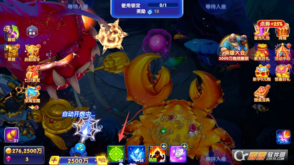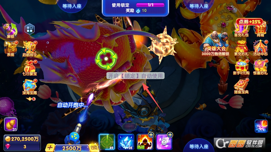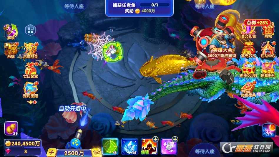 1. 经典猎捕玩法,这是游戏的核心玩法,和传统街机捕鱼玩法一致,玩家进入渔场后,滑动屏幕调整炮台瞄准方向,点击开炮即可捕获鱼类,不同鱼种对应不同分值,捕获分值越高,获得的金币越多。炮台倍率可自由调节,可根据自身金币数量灵活切换,低倍炮稳赚金币,高倍炮冲击高收益。