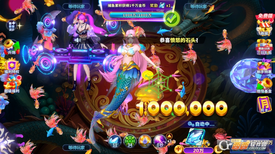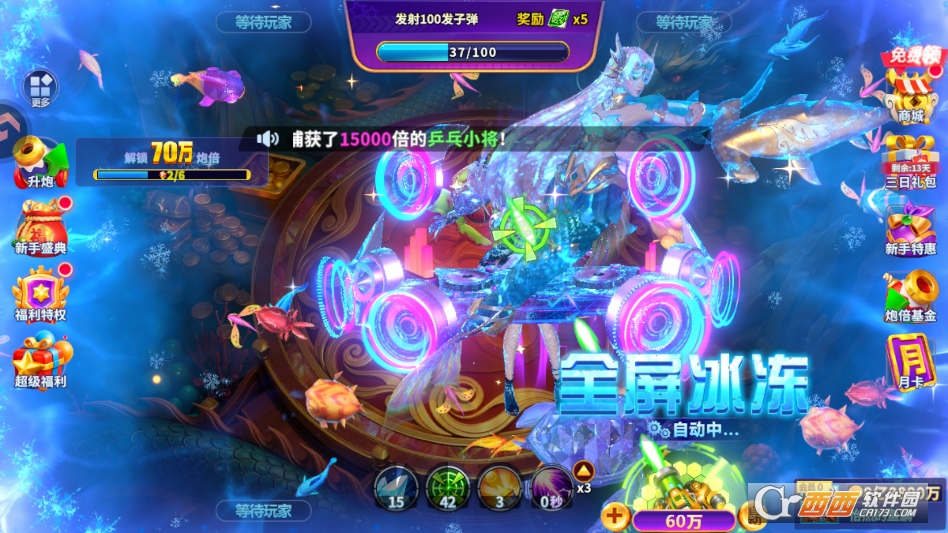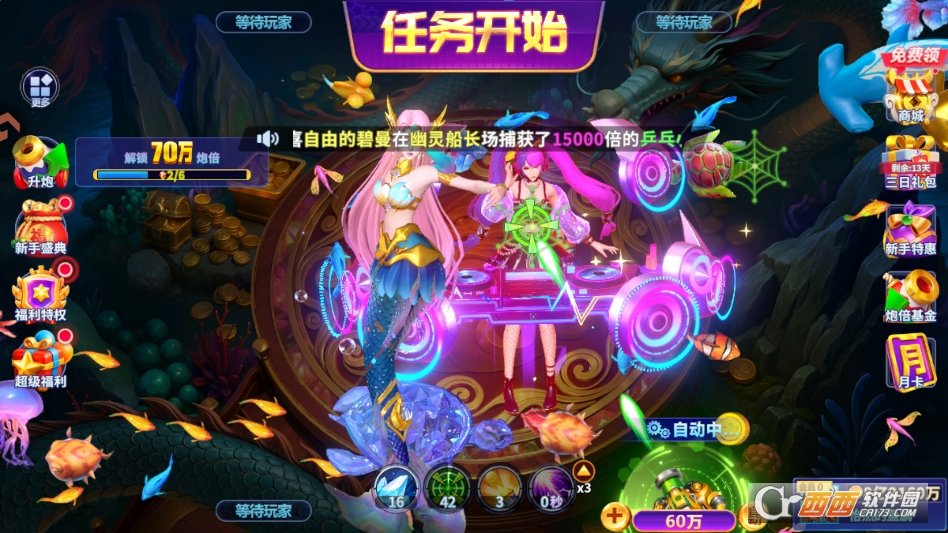 炮台倍率自由切换,从低倍到万倍随意调节,不用氪金就能解锁所有倍率,玩家可根据自己的金币数量和捕鱼技巧,灵活调整倍率,新手可从低倍练手,老手可直接开万倍爆金,适配不同玩家的需求。