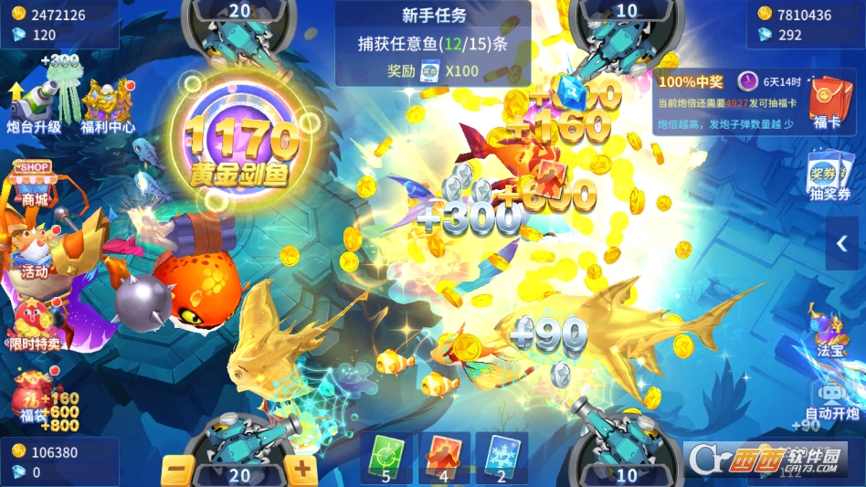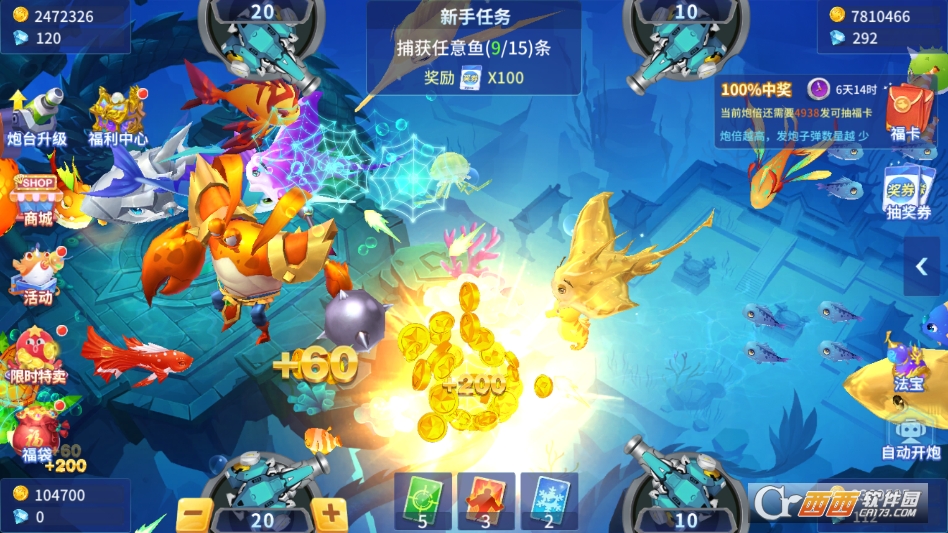 福利真的太丰厚了,上线就送礼包,每天签到、做简单任务还能再领,不用氪金也能有大量金币和道具,开局就能升级高倍炮台,捕鱼爽不停,零氪玩家表示很满意,还能收获新年好运。