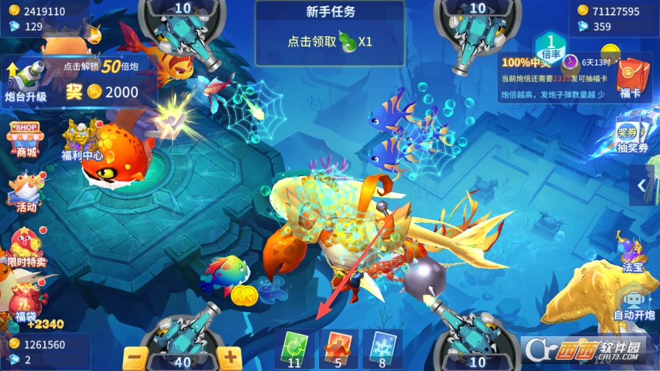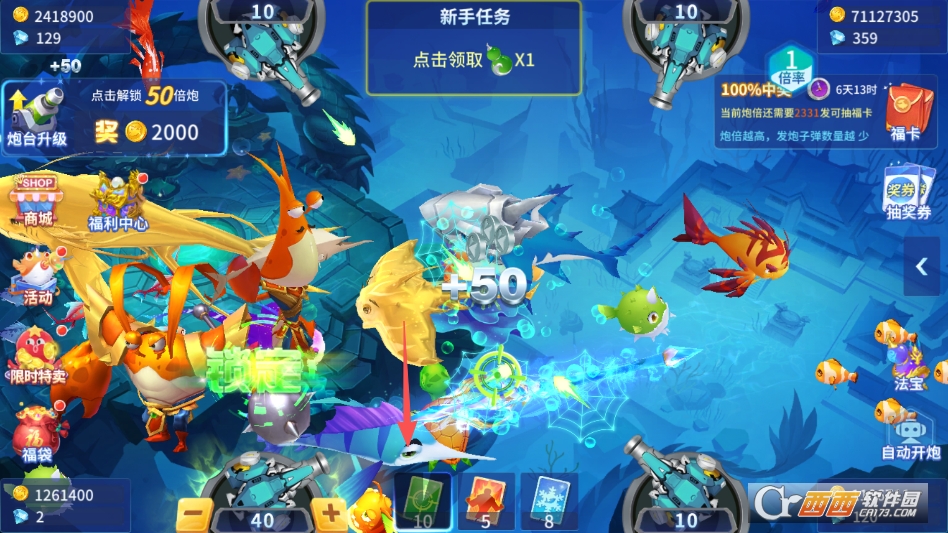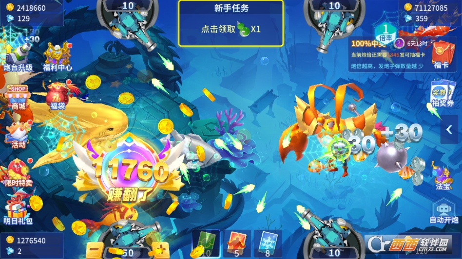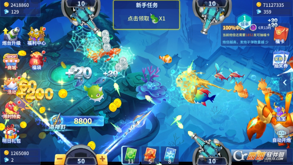 还有日常签到、渔场挑战等基础内容,每日签到可获得金币和基础弹头,完成渔场挑战可解锁更多高级弹头和炮台升级材料,不用爆肝、不用氪金,轻松就能积累资源,解锁所有核心内容。