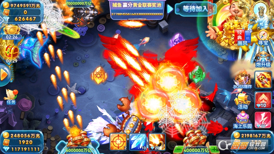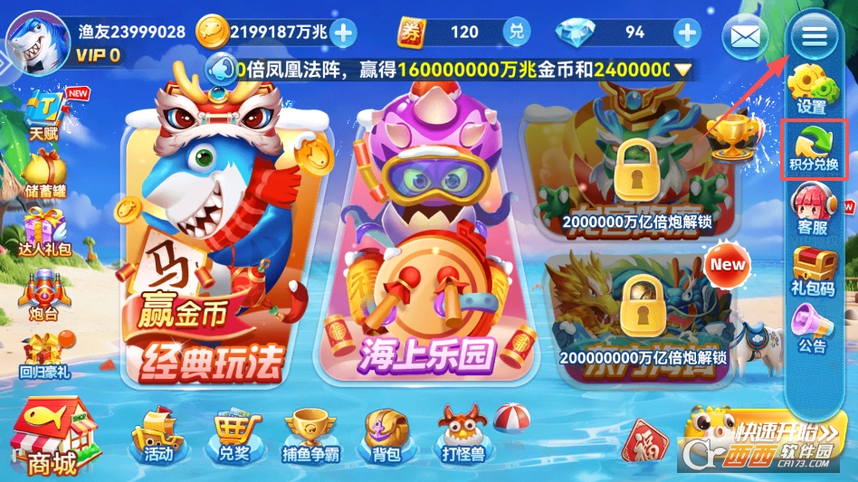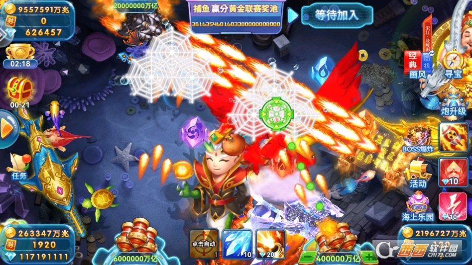 炮台升级玩法,玩家可以用捕鱼获得的金币,升级自己的炮台,炮台等级越高,威力越大、发射速度越快,还能提升炮台倍率,倍率越高,捕获鱼儿后获得的金币就越多,轻松捕获珍稀鱼儿。