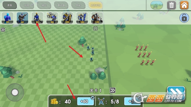 1、开始游戏后,点击上方的士兵然后放置在场地中即可,每一关都有着指定的金币消耗。