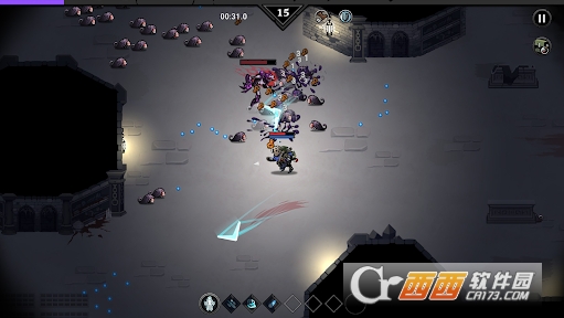 探索与战斗循环:玩家在随机生成的暗黑地牢中探索,拖动屏幕控制法师移动,遇怪物自动触发即时战斗;清除当前场景敌人后进入新区域,每关结尾需挑战 BOSS 解锁后续关卡,且地牢环境会随昼夜循环变化(如白日石像鬼休眠、午夜亡灵强化),需动态调整探索策略。