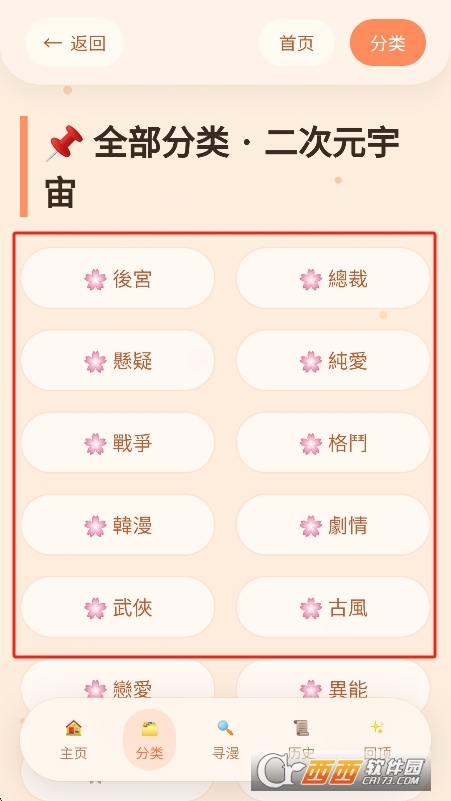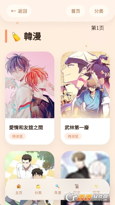 1、首页展示热门推荐、最新上架;点击底部“分类”按题材筛选。