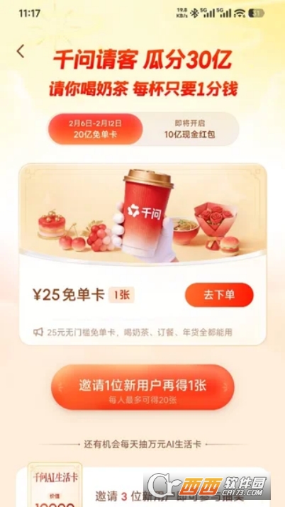 千问app免费领奶茶瓜分30亿现金,只需登录账号即可领取25元奶茶券包,享0.01喝奶茶。20亿奶茶免单卡,10亿红包送不停。来千问过新年,写新春祝福,拍新年福字,做拜年视频。千问还是你的AI生活助理,办公助手,AI生图生视频,解锁春节创意特效,跟亲友好友一起玩,赶紧下载体验吧。