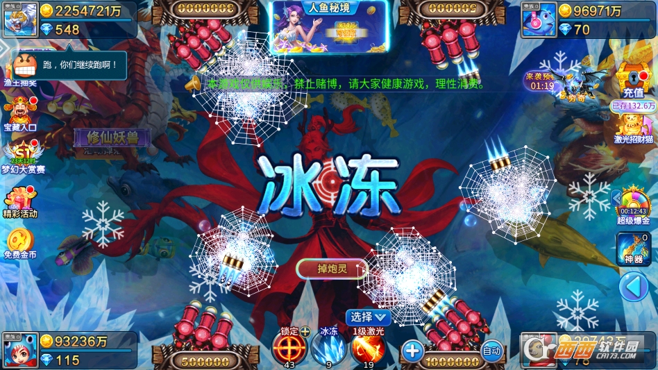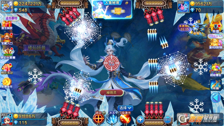 2. 炮台升级玩法,玩家可通过捕获鱼群、完成日常任务获得炮台升级材料和金币,消耗这些资源就能升级炮台,升级后炮台火力翻倍、外观更酷炫,还能解锁无限炮火连击功能,捕鱼效率大幅提升。