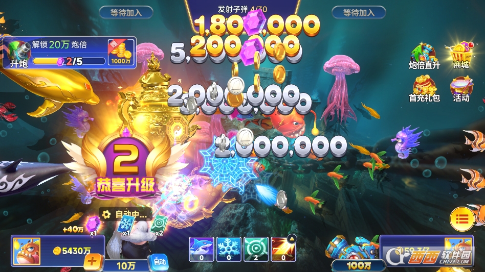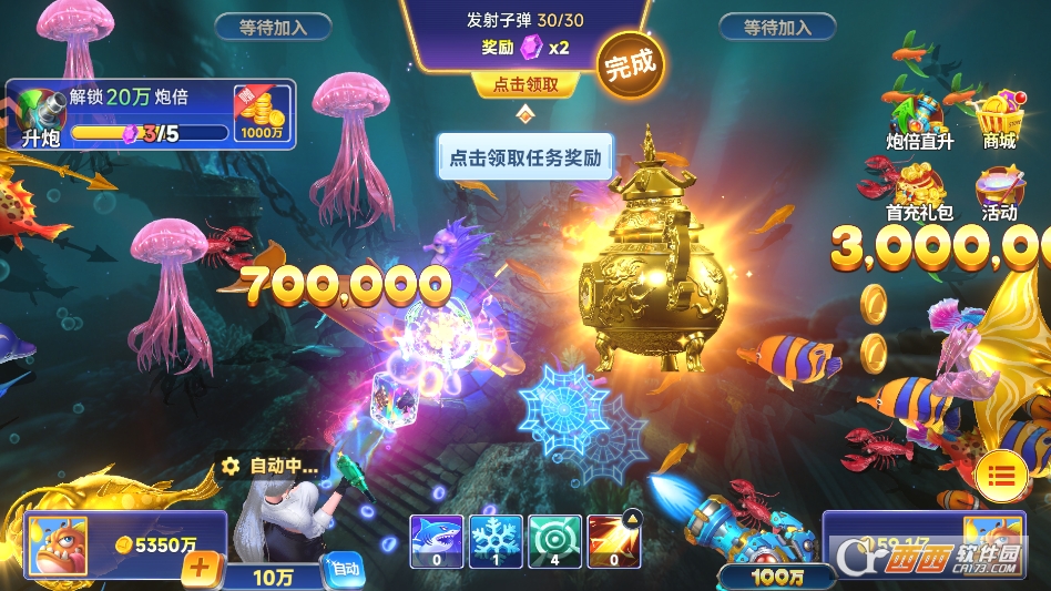 多人联机对战模式,支持全服万人同屏联机,玩家可随机匹配对手,同台比拼捕鱼技巧和收益,捕获的鱼越多、倍率越高,排名就越靠前,结束后能获得额外金币奖励。