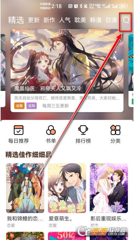 1、先进入喵趣漫画,在页面右上角找到并点选放大镜图标。