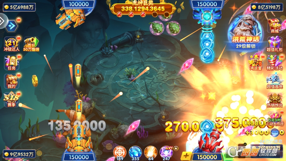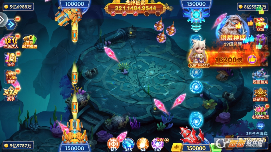 4. BOSS挑战模式,定期刷新黄金龙皇、机械巨鲨等巨型BOSS,每个BOSS都有独特技能和高额生命值,支持单人挑战或组队围猎,击败BOSS可触发全屏金币雨,获得海量奖励和炮台碎片。