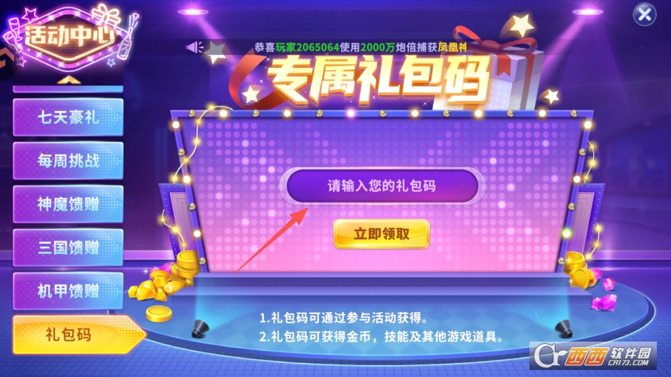 在活动中心页面,将左侧列表拉到最下找到礼包码兑换页面,输入礼包码即可领取奖励