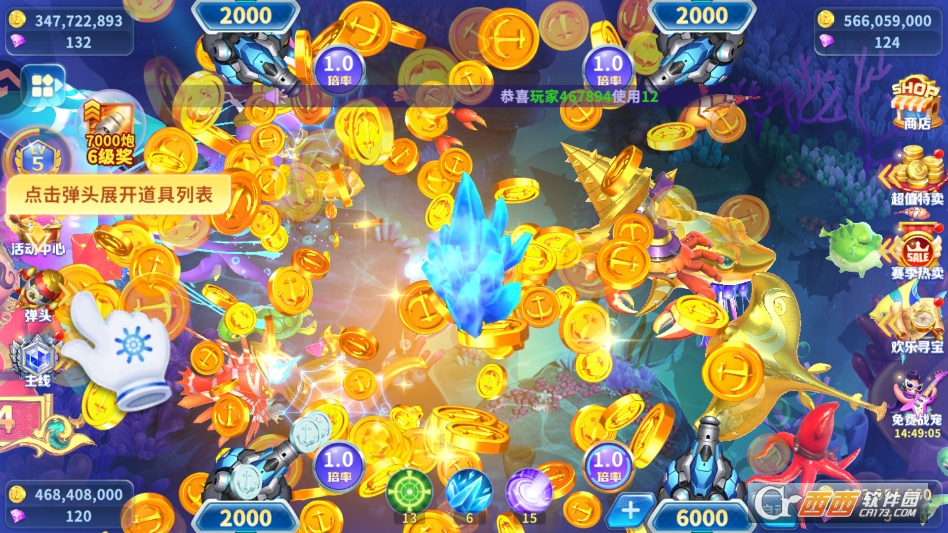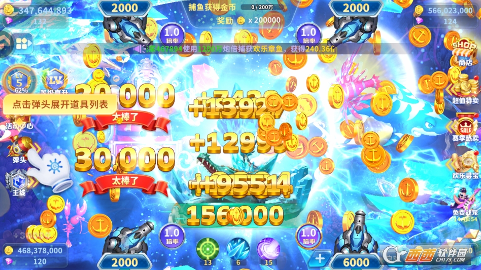 超多道具可以自由使用,锁定弹能精准锁定目标鱼群,冰冻弹能冰封全屏鱼群防止逃走,电击弹能翻倍捕获概率,合理使用这些道具,捕鱼更轻松、更刺激,爽感十足。