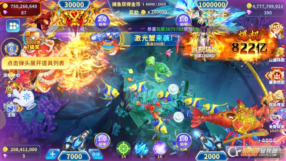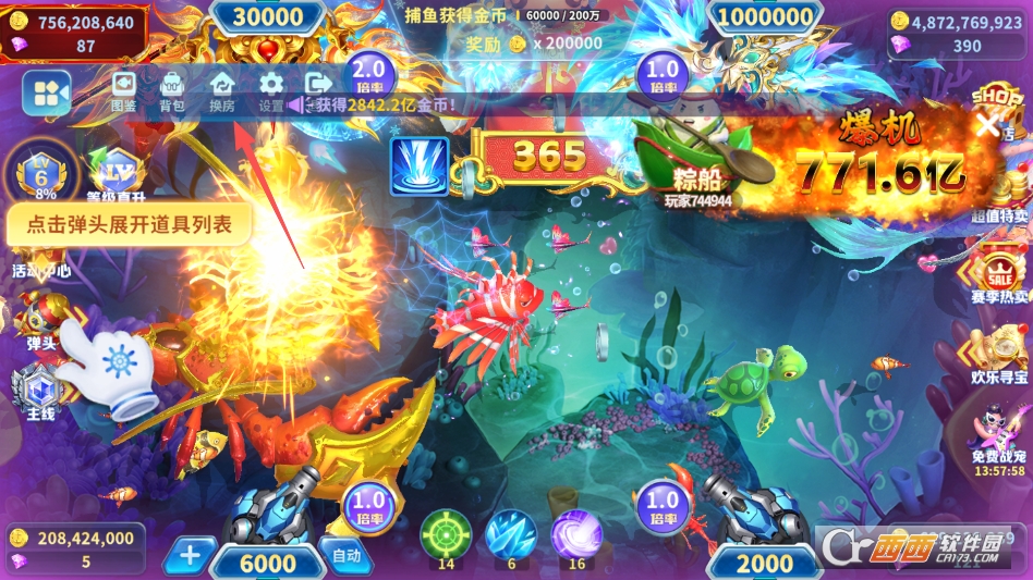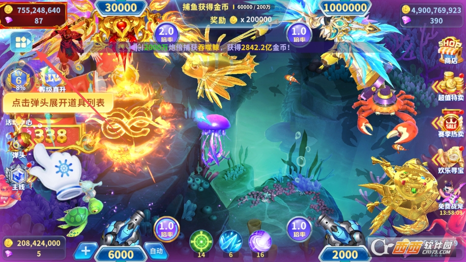 炮台可以自由切换和升级,从基础的低倍率小炮到威力巨大的万倍巨炮,玩家可以用金币解锁高倍率炮台,升级后炮台的威力、射速和暴击率都会大幅提升,搭配强力道具使用,能大幅提升捕获效率。