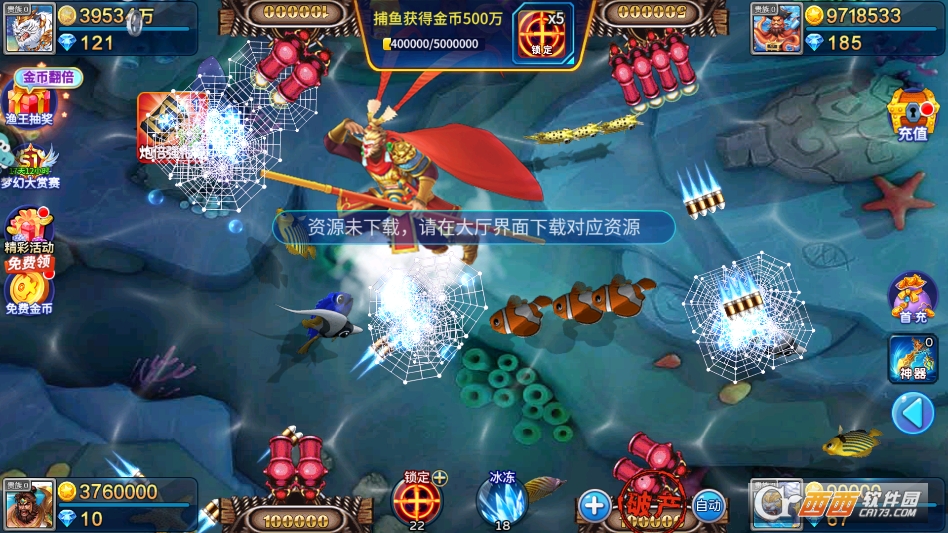 游戏内还有多种强力道具可以使用,激光炮能精准锁定单个高倍率鱼群或BOSS,全屏炸弹能一次性捕获范围内所有鱼群,冰冻道具能冻结鱼群,方便精准捕获,合理使用道具能大幅提升捕鱼效率和奖励收益。