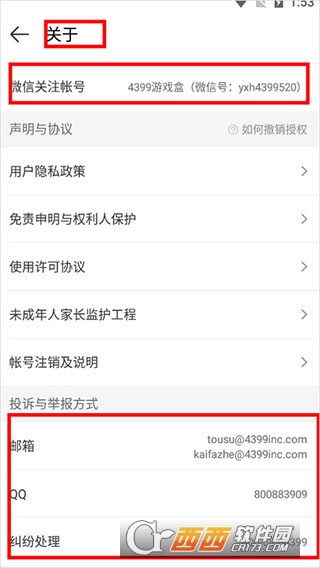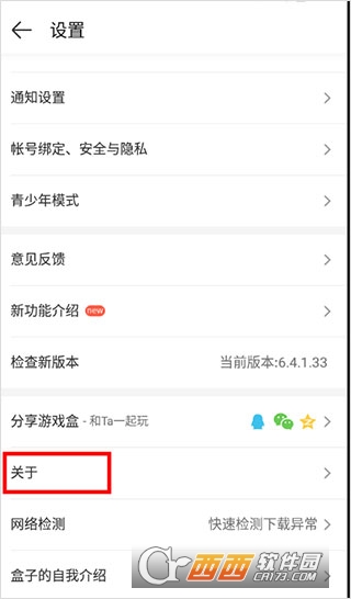 2、进入设置界面,选择“关于”,即可查询4399游戏盒子客服联系方式。