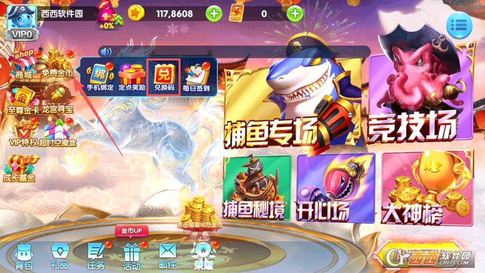 点击左上角的免费金币按钮,在呼出选项之后再点击兑换码按钮