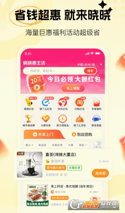 晓晓优选app是一款专注于本地生活服务的实用软件,深耕外卖省钱领域,兼顾多元生活权益,为用户打造高性价比的日常消费体验。软件依托精准定位技术,实时推送周边优质美食活动,联动美团、饿了么等主流平台,每日放送大额外卖红包,更有单单极速返现核心福利,返利审核秒通过、无需提现直接打款,无套路兑现优惠。平台覆盖塔斯汀、绝味鸭脖等众多人气品牌,正餐、饮品、小吃等全品类美食一应俱全,还延伸出高德打车、特价电影票等同城生活权益,一站式满足日常消费需求。软件操作流程简洁易懂,新手教程直观引导,页面布局清晰且支持福利精准筛选,同时打造社交裂变玩法,邀请好友成团可解锁额外现金奖励。目前已落地杭州、北京、上海等多个城市,凭借高效的福利兑现、丰富的优惠活动和贴心的操作指引,成为用户日常点外卖、享生活的优质服务选择。