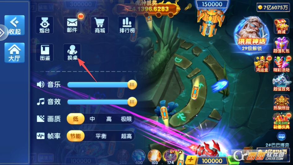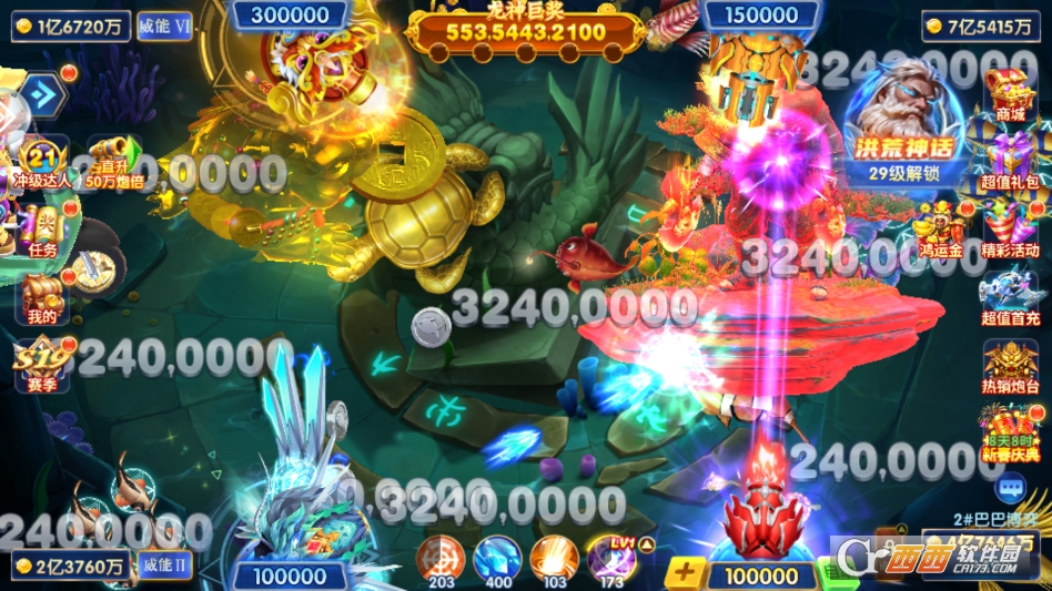 炮台升级玩法贯穿全程,玩家可消耗金币升级炮台等级,等级越高,炮台威力越大、攻击范围越广,捕获高价值鱼群与BOSS的概率也越高,部分高阶炮台还带有专属特效,可大幅提升捕鱼收益。